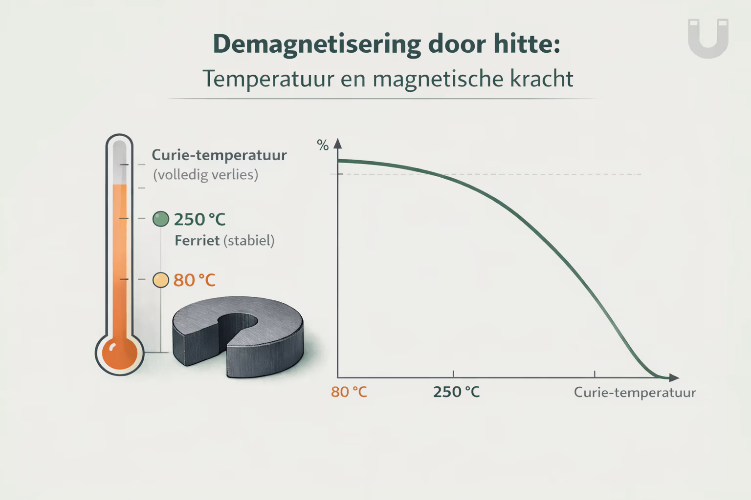 Bij het bereiken van de Curie-temperatuur verandert de interne kristalstructuur van het magneetmateriaal definitief. De magnetische eigenschappen verdwijnen volledig en opnieuw magnetiseren is niet meer mogelijk. Deze temperatuur ligt bij neodymium en ferriet ver boven de normale gebruiksomstandigheden, maar vormt wel de absolute bovengrens.