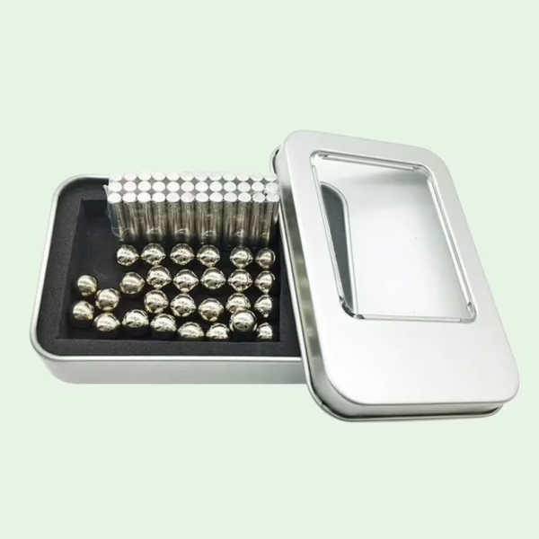 De set bevat 36 zilverkleurige magneetstaafjes (3,6 mm × 23 mm) en 27 zilverkleurige metalen balletjes (8 mm).