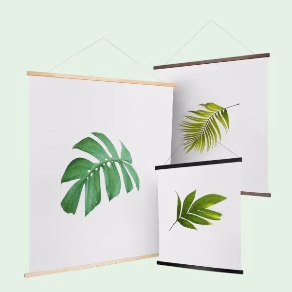 Elke set bestaat uit twee houten strips met ingebouwde magneten. Je legt de bovenkant van je poster tussen de strips, waarna de magneten elkaar aantrekken en de poster stevig omsluiten. De onderste strip geeft extra gewicht waardoor de poster mooi recht blijft hangen. Met het koord of haakje hang je alles moeiteloos op. Het is een eenvoudige, nette oplossing die geschikt is voor allerlei formaten prints.