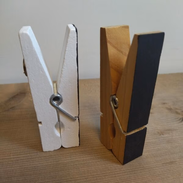 Magneetknijper in vier keuzes: blank hout, wit, blank met schoolbordzijde en wit met schoolbordzijde. De laatste twee zijn dus met krijt te beschrijven. Als leuk cadeautje of handig voor eigen gebruik aan je magneetbord of koelkast.