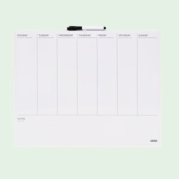 Deze whiteboard weekplanner is handig in gebruik om overzicht te krijgen op de week. Met een handig vak aan de onderzijde voor het bijhouden van wat notities. Geleverd met een gratis whiteboardstift met een smalle punt en ophangmateriaal.